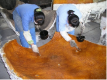 The various colors, patterns and textures obtained in the patina process are achieved through a combined application of chemicals and heat,